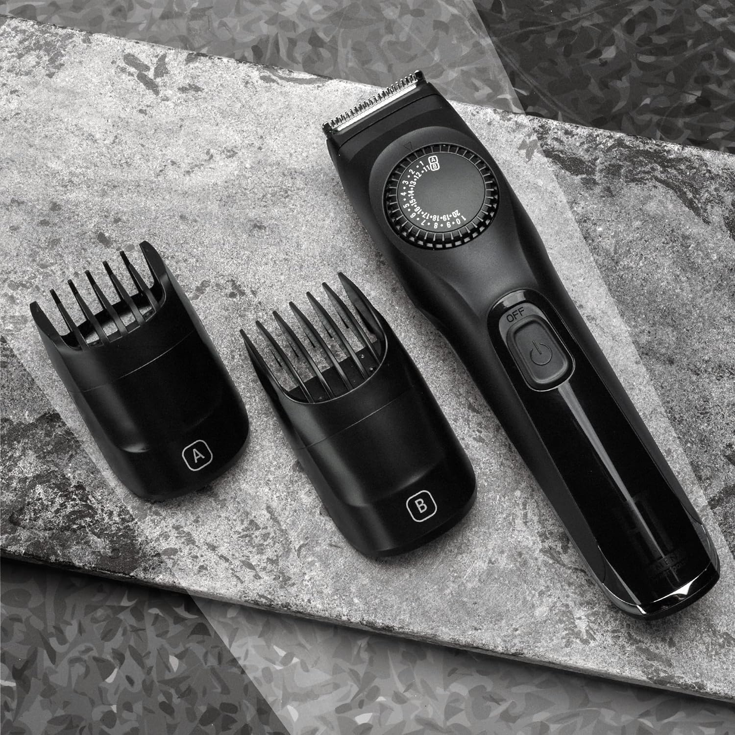 - ACCESSORIES: Includes comb attachments (A: 1-10mm and B: 11-20mm)