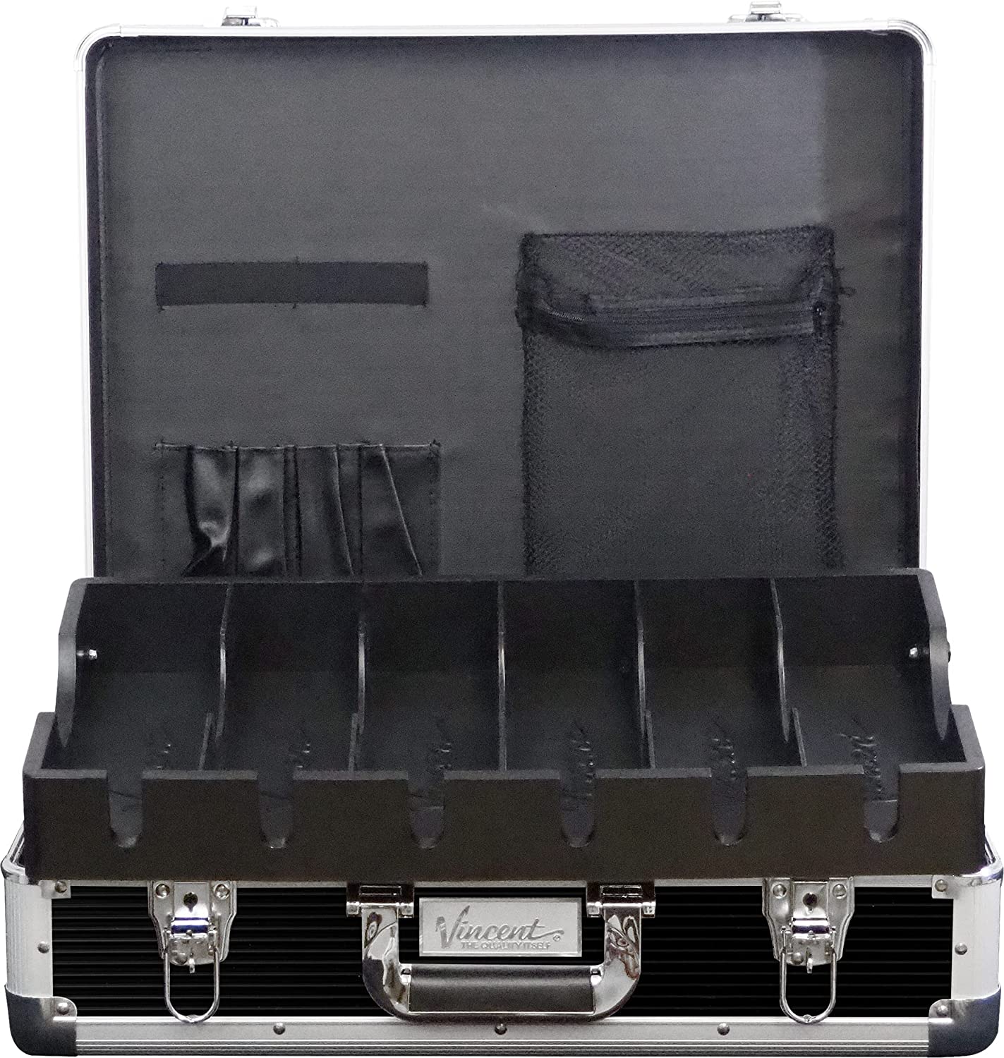 4 leather holders, elastic security band, 1 zippered mesh pocket, elevating clipper case with round notches for cord organization
